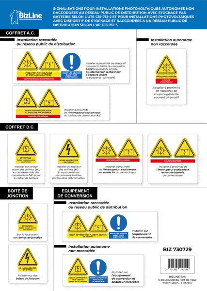 Ce kit regroupe 27 étiquettes de signalisations photovoltaïques demandées dans le cadre d'une installation raccordée au réseau public de distribution avec un dispositif de stockage par batterie ou une installation autonome non raccordée avec un dispositif de stockage par batterie.