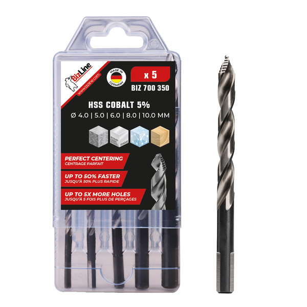 Jeu de 5 forets : Ø 4 / 5 / 6 / 8 / 10 mm.